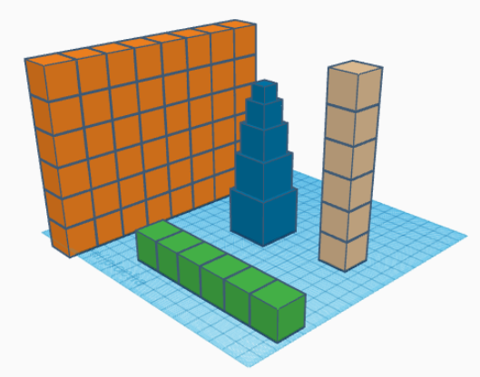 - Postav "komín" ze zmenšujících se modrých krychlí. Největší má délku hrany 30 mm, menší 25 mm, další 20 mm, pak 15 mm a nejmenší 10 mm.
