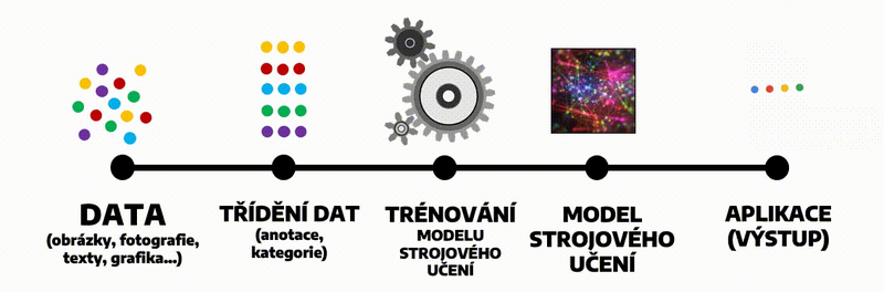 Základem jsou pro ni data = informace - nejrůznější druhy textových či obrazových dat, které třídí, propojuje, vyhledává, porovnává a uspořádává dle konkrétního požadavku. Na základě natrénování umělé inteligence pak vznikne tzv. model strojového učení,