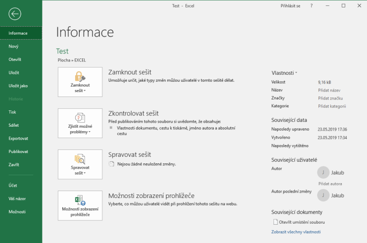 Po otevření karty Soubor se nám zobrazí nástroje pro práci se souborem (sešitem). Informace o souboru obsahují informace a základní vlastnosti aktuálního souboru.