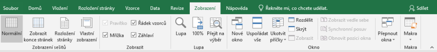 Karta Zobrazení obsahuje Zobrazení sešitů, Zobrazit, Lupa, Okno a Makra. Umožňuje nám tedy nastavit různé zobrazení a nastavení listů a maker.