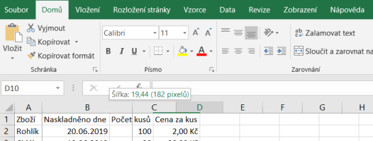 Pokud chceme změnit šířku sloupce myší, přetáhneme okraj na pravé