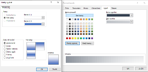 Pokud nám nevyhovují možnosti barev, které jsou nabízeny jako přednastavené, stačí když nad označenými buňkami klikneme pravým tlačítkem a vybereme možnost Formát buněk. Zobrazí se nám již známé dialogové okno Formát buněk. Klikneme na záložku Výplň, kde mimo barvy výplně můžeme také nastavit Efekty výplně, nebo vybrat Barvu vzorku a Styl vzorku.