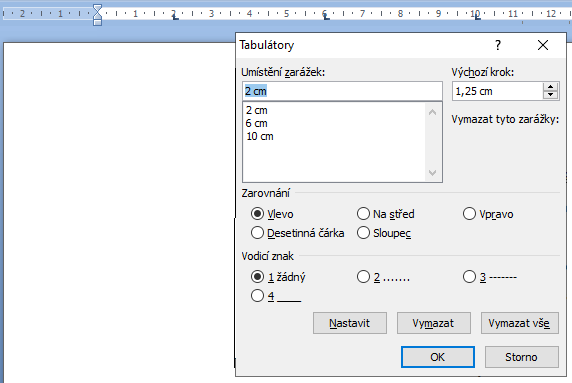 Záložka se vytvoří kliknutím na pravítko v požadované vzdálenosti. Pomocí pravého tlačítka myši zobrazíš nabídku dalších možností zarovnání, případně vložení vodících znaků.