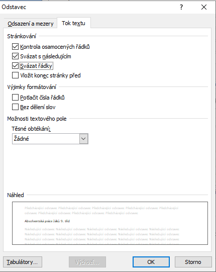 Přejdi na záložku Tok textu a zatrhni Kontrola osamocených řádků, Svázat s následujícím, Svázat řádky. (Tyhle funkce zamezí, aby na nové stránce byl jeden řádek z odstavce.) Ulož. - Projdi celý dokument a nastav styl nadpisů – Nadpis 1, Nadpis 2 (nejdříve smaž nápovědu). Ukládej.