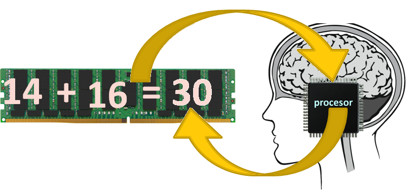 Operační paměť je čip, ve kterém má procesor to, s čím právě pracuje. Náš mozek funguje podobě: musí si (chvilku) pamatovat čísla, se kterými má počítat (14 a 16). Potom se zamyslí a provede výpočet. Výsledek (číslo 30) si musí opět (chvilku) pamatovat, než ho někam (do sešitu) zapíšeme (uložíme).
