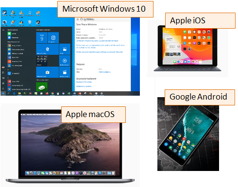 Na mobilních telefonech iPhone a tabletech používá firma Apple systém iOS. Na mobilních telefonech mnoha různých výrobců se využívá operační systém Google Android.