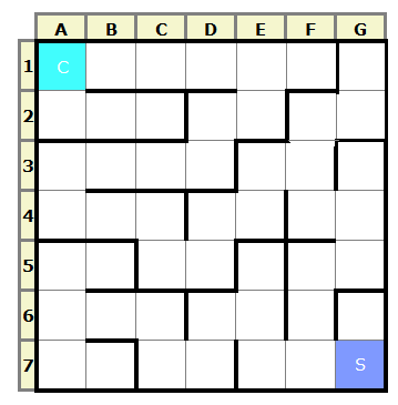 Cestu si můžeme označit lomenou čarou (navazujícími úsečkami), pomocí souřadnic jednotlivých políček (start na G7, ... cíl A1), můžeme políčka vybarvovat - ta, po kterých bludištěm projdeme, jednou barvou, ostatní jinou barvou.