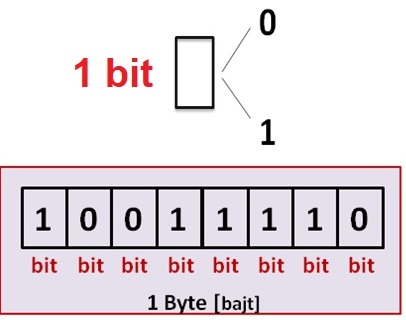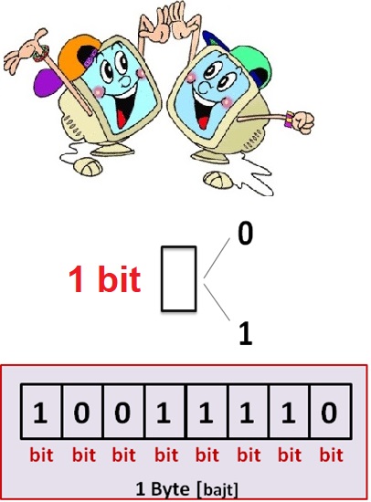 Jeden bit v počítači je (jedno) políčko, ve kterém je buď 0 nebo 1. Všechna data v počítači jsou pouze 0 a 1. Přesněji: počítače používají tzv. dvojkovou (binární) soustavu. Ta používá pro záznam dat dvě číslice, a to 0 a 1.