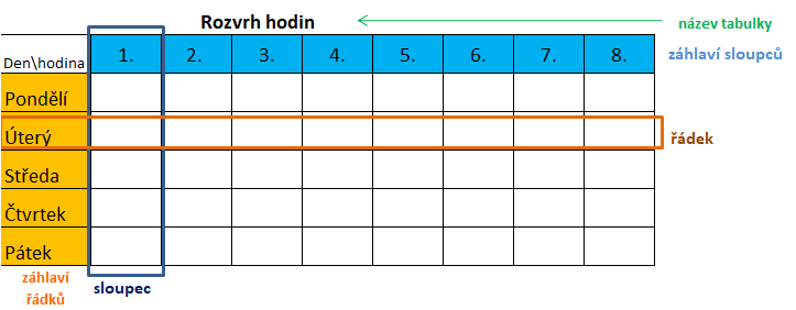 Políčko v tabulce se nazývá buňka. Podle množství údajů volíme počet řádků a sloupců. Nesmíme zapomenout přidat jeden řádek a jeden sloupec na záhlaví. Do záhlaví uvádíme názvy dat, která do tabulky zapisujeme. Název tabulky nemusí být uveden.