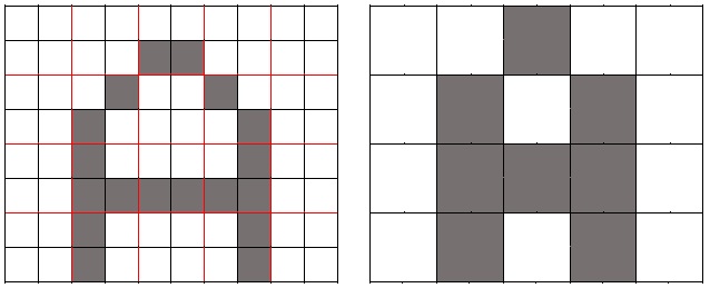 Na každý pixel u rastrového obrázku potřebuje počítač nějakou velikost paměti. U každého si pamatuje informaci o jeho barvě. Když jsme kódovali (rastrový) obrázek, tak se stejně barevná pole shlukovala. Když na sebe úsečky u (vektorového) obrázku navazovaly, tak jsme vynechávali společný bod. Zmenšit počet pixelů a přesto zachovat aspoň zhruba tvar objektu můžeme tak, že sousedící pixely spojíme do jednoho s převažující barvou.