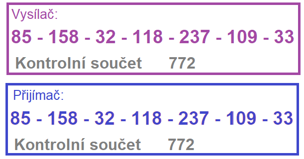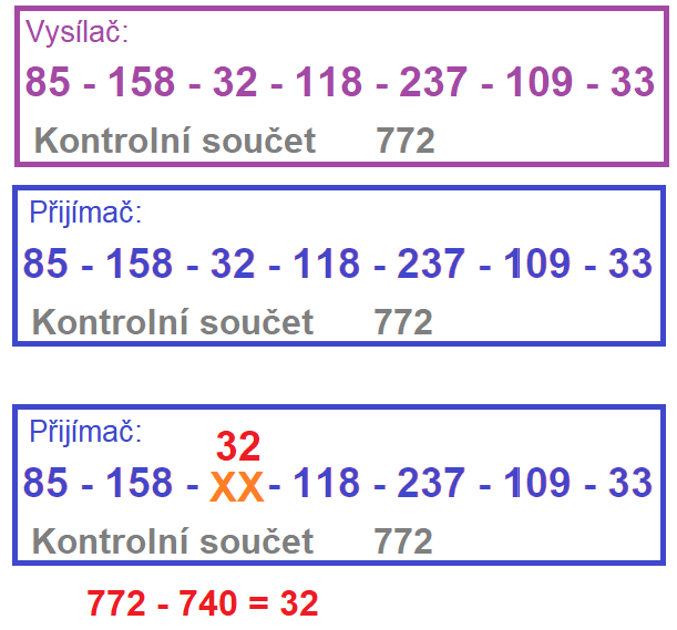 Přijímač zná stejný algoritmus (postup) a také vždy po určené skupině čísel vypočítá jejich (kontrolní) součet a porovná ho se součtem, který mu došel od přijímače.