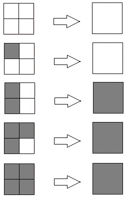 Čtyři pixely tvořící čtverec spojíme do tohoto jednoho většího čtverce. Otázkou pak je, jakou bude mít tento čtverec barvu.