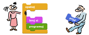 Vizuální programování znamená, že se nemusíš psát s žádným textem, ale naopak pracuješ s obrázky. Skládáš za sebe již předepsané příkazy, a tak se nemusíš bát, že uděláš chybu v zápisu, tedy že zapomeneš čárku, uvozovky nebo že některé slovo špatně zapíšeš.