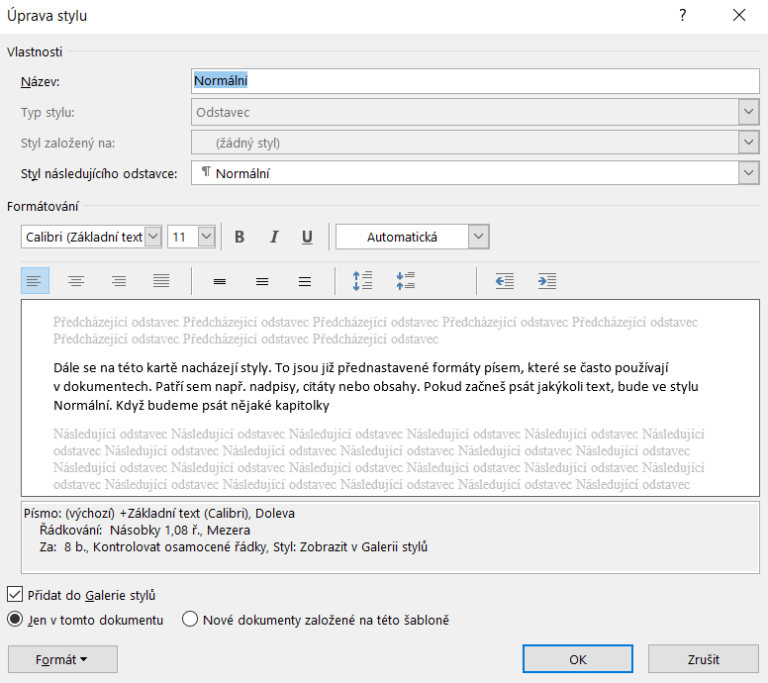 Dále se na této kartě nacházejí styly. To jsou již přednastavené formáty písem, které se často používají v dokumentech. Patří sem např. nadpisy, citáty nebo obsahy. Pokud začneš psát jakýkoli text, bude ve stylu Normální. Když budeme psát nějaké kapitolky, měli bychom pro jejich název použít styl Nadpis. Tyto styly můžeme upravovat, když na ně klikneme pravým tlačítkem myši a zvolíme možnost Změnit. V tomto okně můžeme změnit všechny vlastnosti, o kterých jsme si již řekli, ale také něco navíc. Tyto volby najdeme pod tlačítkem Formát, kde najdeme přesně to, co hledáme.