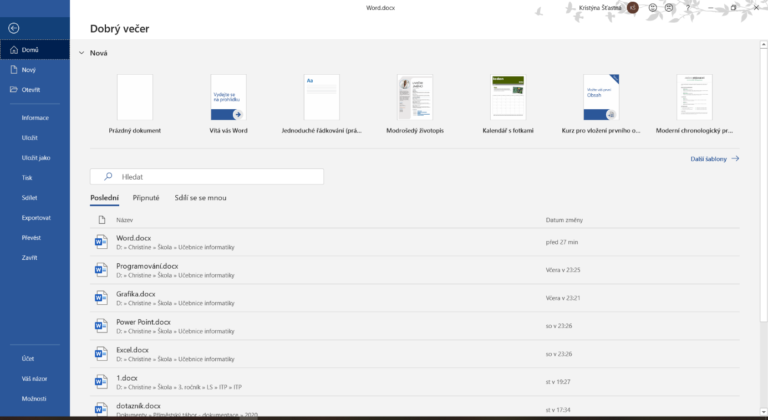 Pokud máš text napsaný a potřebuješ ho uložit nebo vytisknout, přejdeš na kartu Soubor. Na ní taky můžeš vytvořit soubor nový, otevřít již existující soubor nebo zobrazit informace o souboru či programu.