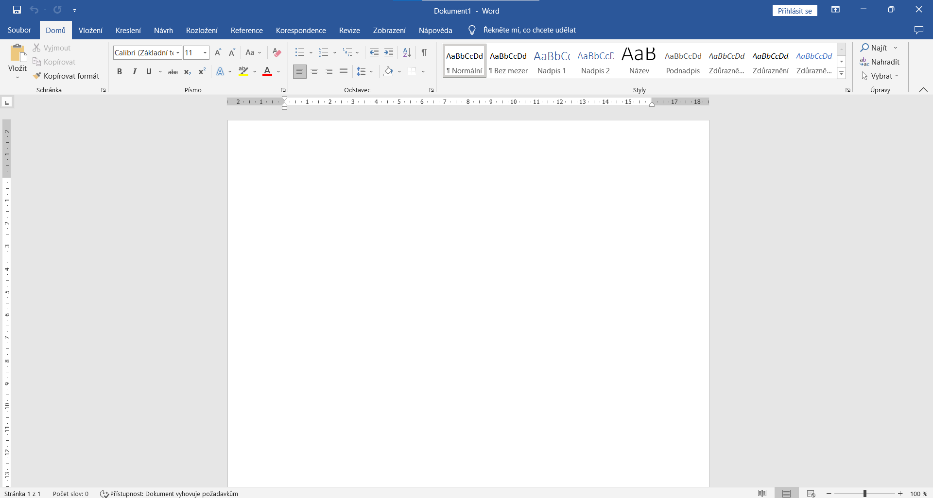 První, co po otevření programu uvidíme, je prázdná stránka, na kterou můžeme psát. Nad stránkou najdeme spoustu možností a volem, které se nacházejí v tzv. pásmu karet. Najdeme zde změnu fontu písma (to, jak písmo vypadá), nastavení stylu psaní, vkládání obrázků či obsahů, nebo dokonce i kontrolu pravopisu.