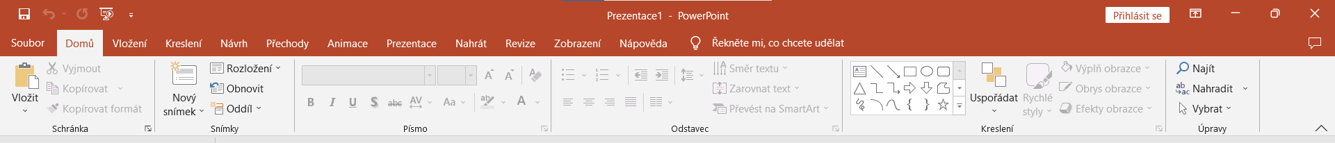 Nové snímky přidáme pomocí tlačítka na kartě Domů. Zde také nastavujeme písmo jako u Wordu či vkládáme obrazce.