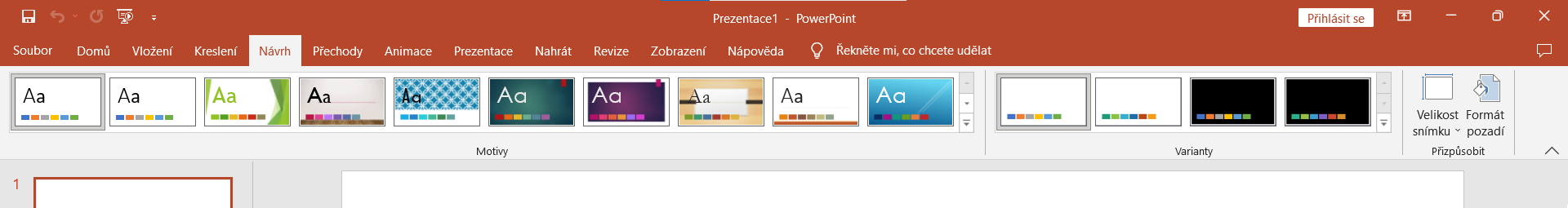 Aby prezentace také nějak vypadala, pomůže ti karta Návrh. Každá nová prezentace jsou jen bílé listy s černým textem. Pokud chceme prezentací zaujmout, měli bychom ji nějak oživit. V této kartě najdeme již přednastavené návrhy, jak by prezentace mohla barevně vypadat.