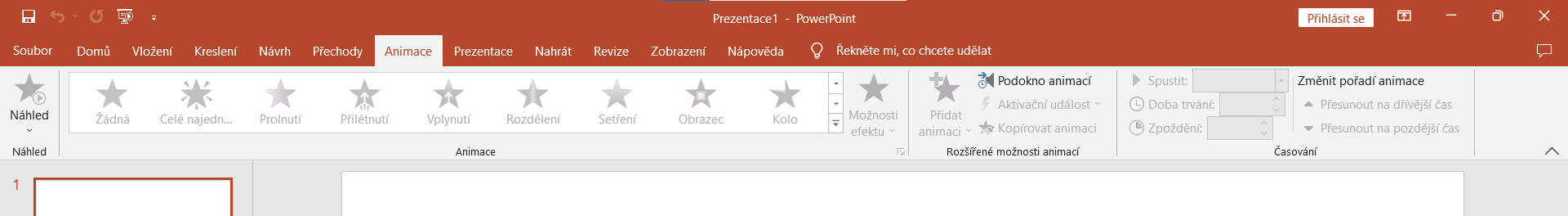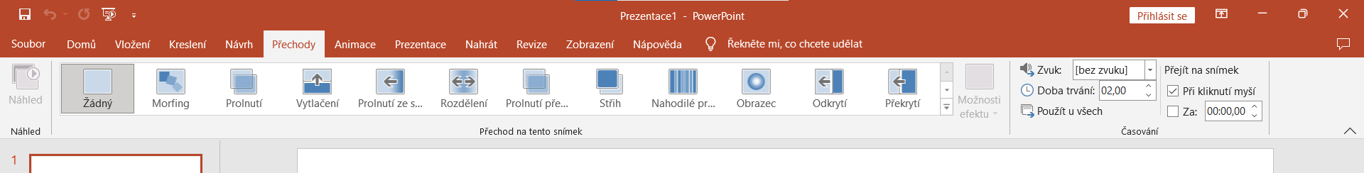 Další důležitou kartou jsou Přechody. Když vytvoříme více snímků, tak je hezčí, když se mezi sebou animují, než aby se pouze zobrazily. K těmto animacím slouží přechody snímků, kde jeden může ten druhý vytlačit, překrýt, nebo dokonce překrýt jako šachovnice. Také zde najdeme možnosti časování. To znamená, kdy se má nový snímek zobrazit. Na začátku je vše nastaveno na kliknutí myši, ale pokud si vše dobře načasuješ, můžeš pouze mluvit a počítač již veškeré zobrazování a přepínání snímků zařídí sám.