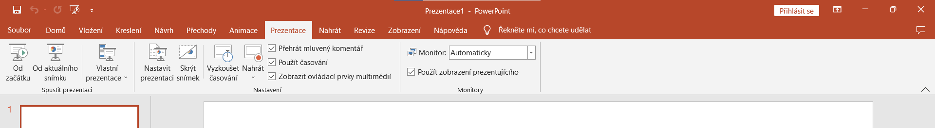 Poslední důležitou kartou je Prezentace. Na této kartě najdeš časování celé prezentace, zobrazování poznámek pro prezentující nebo styl, jakým prezentaci budeš prezentovat, jestli na plátno, monitor, nebo jen tak.