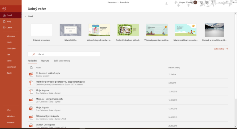 Když máš prezentaci hotovou, tak ji určitě nezapomeň uložit. Také během práce bys měl pravidelné ukládat, abys neztratil celou práci. To vše najdeš v kartě Soubor. Zde vše uložíš, otevřeš již existující prezentaci nebo vytvoříš novou.