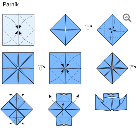 Jednotlivé obrázky popisují postup při skládání origami - parníku. Zkus postup zapsat slovně bez obrázků.