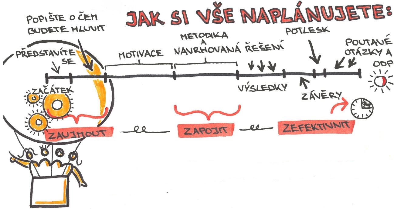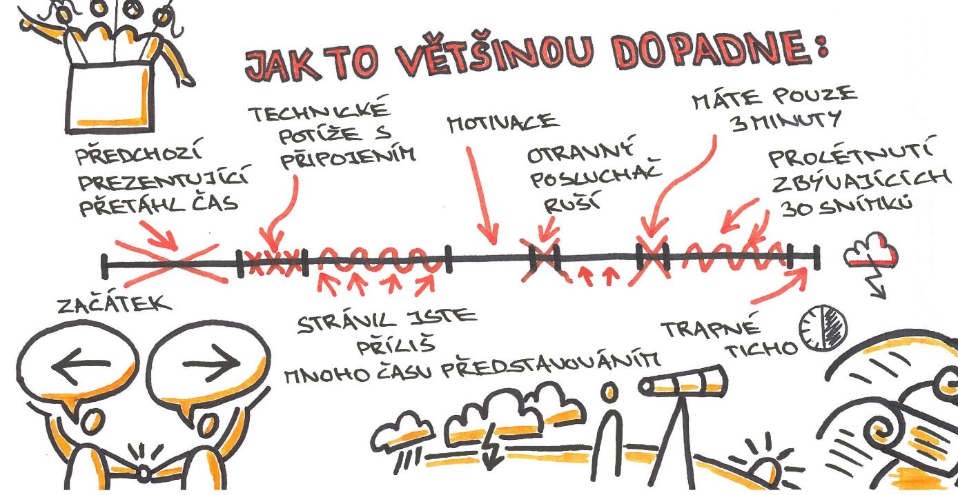 Obecně platí, že je lepší skončit o pár minut dříve, než přetahovat a ubírat tím čas někomu jinému. Proto, pokud je prezentace až moc dlouhá a bojíš se, že ji nestihneš celou odprezentovat, zvaž zobecnění méně důležitých částí, anebo některé z nich rovnou vypusť.