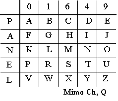 Podle následující tabulky (slovo PANEL a čísla 0, 6, 4, 9) by bylo slovo AHOJ zapsáno P0 A6 N9 A9.