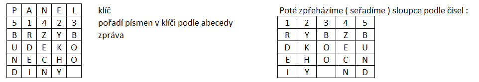 A teď, aby to nebylo jednoduché napíšeme vše po sloupcích a to do skupinek po pěti písmenech. Nakonec tedy vznikne: RDEIY KHYBO O ZEC NBUND.