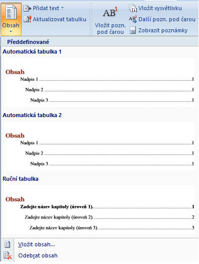 - Aktualizuj obsah - kliknutím na obsah se nahoře objeví nabídka Aktualizovat tabulku. Je třeba aktualizovat celou tabulku nejen čísla stránek. Ulož.