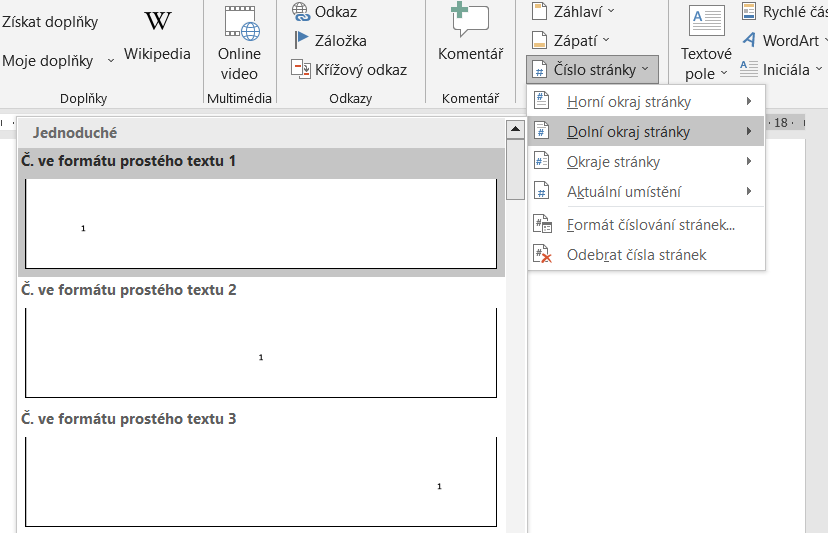 Z nabídky si můžeš vybrat, kam chceš čísla stránek vložit – nahoru do záhlaví, dolů do zápatí, dále doprostřed či k okraji, můžeš si vybrat grafickou úpravu číslování.