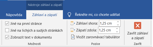 Pokud pracuješ v záhlaví či v zápatí, ostatní text se zobrazuje šedou barvou, zápatí a záhlaví je odděleno. Když přejdeš k textu dokumentu, naopak se zobrazí šedou barvou text v záhlaví a zápatí.