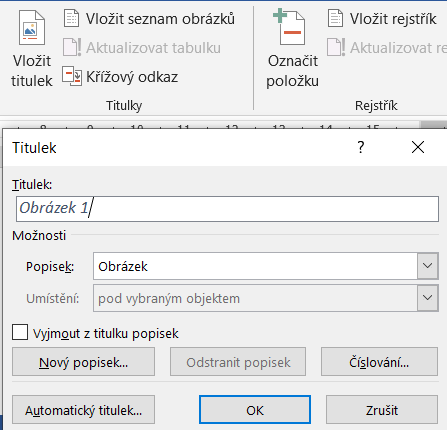 Po otevření se jako titulek zobrazí název Obrázek 1, za něj dopíšeš skutečný název tvého obrázku a zvolíš, kam se má titulek zapsat (Umístění) a potvrdíš.