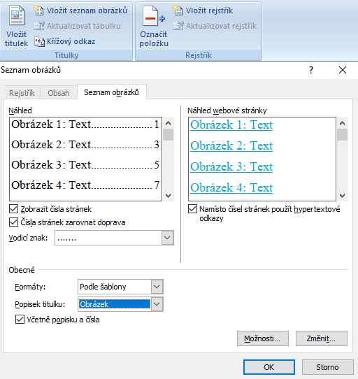 Pro vložení seznamu tabulek nebo grafů postupuješ stejně, jen z nabídky Popisek titulku vybereš tabulku nebo graf.