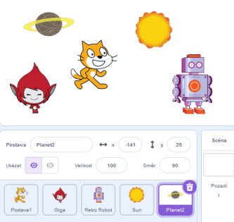 - Základem prostředí Scratch je scéna, na které se nachází postava (později i více postav).