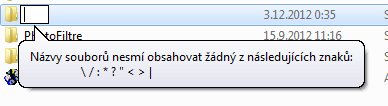 Ikona je stejná pro všechny složky. Je to žlutá složka pod kterou je napsaný název. Název může obsahovat až 256 znaků, nesmí tam být tyto znaky < > * : \ / ? | . Pokud se je přesto pokusíte do názvu umístit objeví se upozornění (viz obrázek).