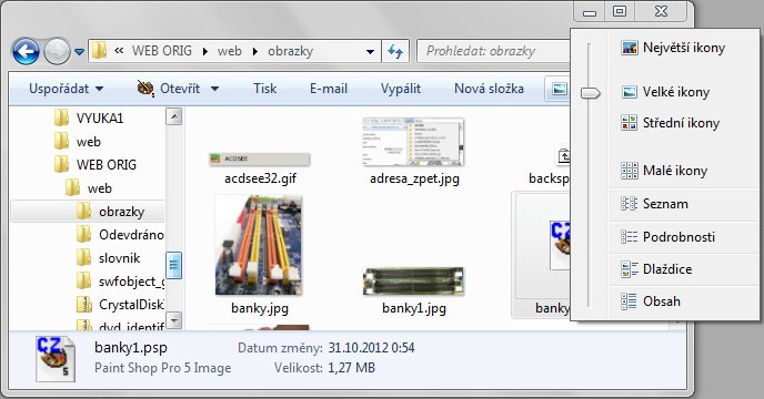 - NEJVĚTŠÍ IKONY - procházení fotogalerií nebo obrázků, kde je málo položek, nebo pokud si potřebuji položky důkladně prohlédnout. (Vidím velký náhled a název).