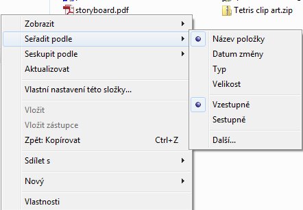 nastavené. Řazení vyvolám kliknutím pravým tlačítkem do
