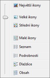 Existuje několik způsobů zobrazení objektů (ikon složek, souborů a disků) - viz obrázek vpravo. Mezi těmito zobrazeními se můžeme přepínat. Každé z těchto zobrazení je vhodné pro určité složky nebo soubory a na jiné je úplně nevhodné. Jak nejjednodušeji si můžeme zobrazení změnit a z jakých zobrazení si můžeme vybírat se můžete podívat zde.