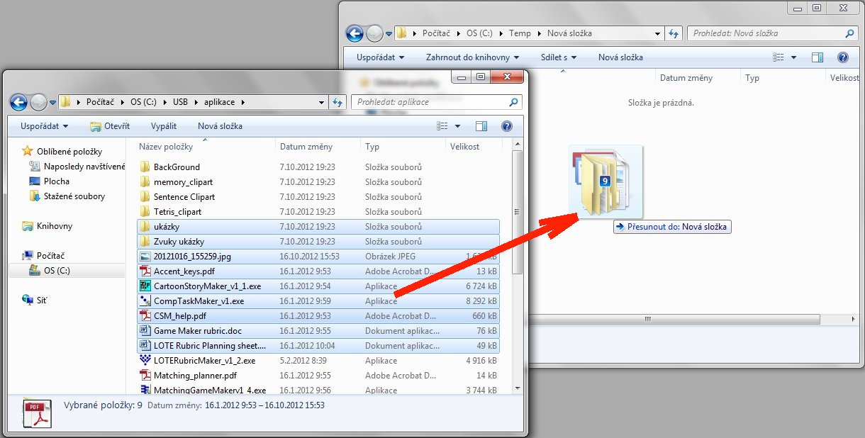 Pokud budeš chtít kopírovat složku mezi různými disky, třeba z počítače na flashku, stačí ji jen myší přesunout tam, kam ji chceš zkopírovat. Najeď na ni myší, podrž levé tlačítko a složku přetáhni na nové místo.
