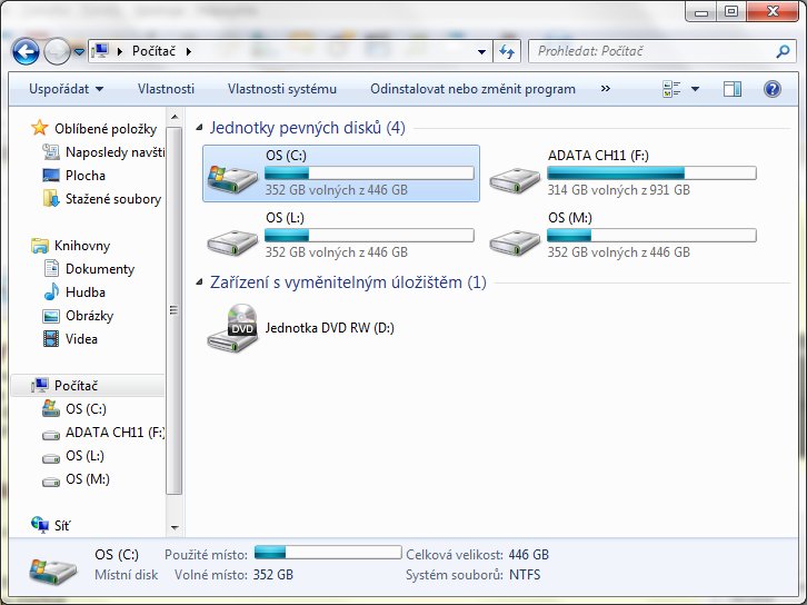 Počítač zobrazí všechny lokální datová uložiště, připojená výměnná média a namapované síťové disky, dále zobrazí připojená zařízení jako je čtečka nebo mobil.