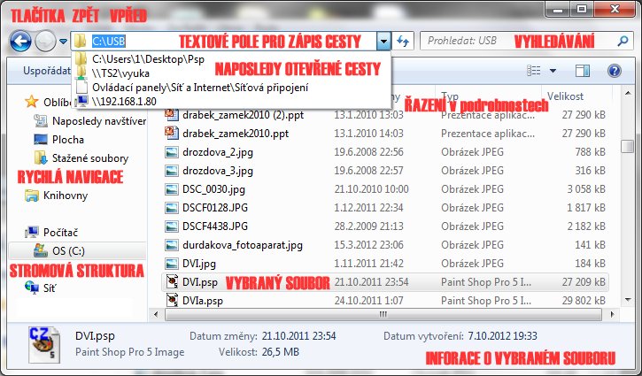 - OBSAH - procházení obrázkových souborů, kde je hodně položek. (Vidím náhled a celý název, velikost a datum změny).