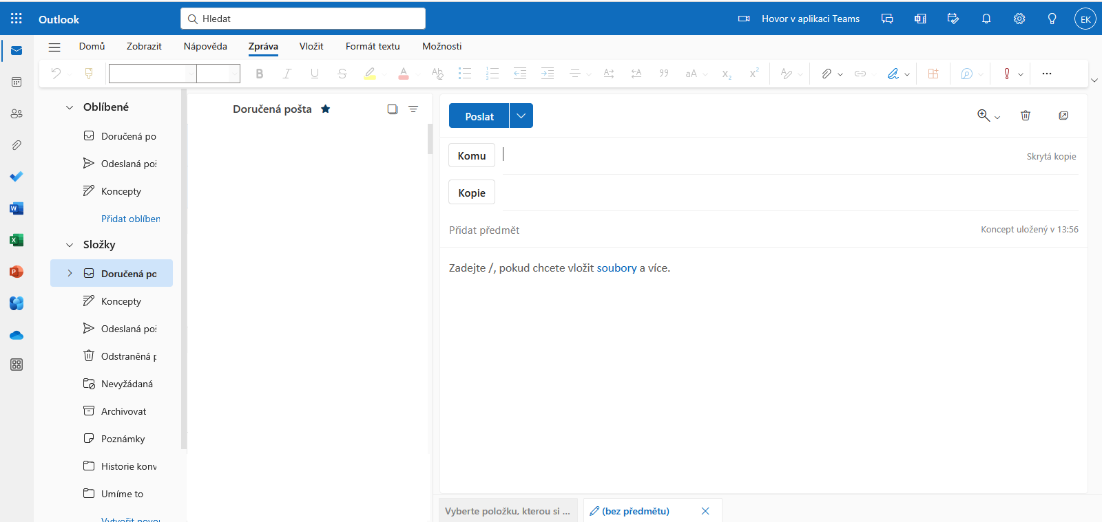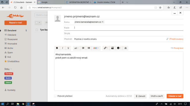 Aby zpráva odešla, stačí kliknout na tlačítko "Poslat" (v Outlooku) nebo "Odeslat e-mail" (na Seznamu). Pokud sis to náhodou rozmyslel a zprávu chceš smazat, klikni na ikonu koše vpravo nahoře nebo "Zahodit". Nevíš, co bys ještě napsal, ale přijde ti, že toho posíláš málo? Není nic jednoduššího, než si e-mail uložit později se ke psaní vrátit. V Outlooku se zpráva automaticky ukládá do složky "Koncepty", na Seznamu zprávu uložíš do rozepsaných tlačítkem "Uložit a zavřít".